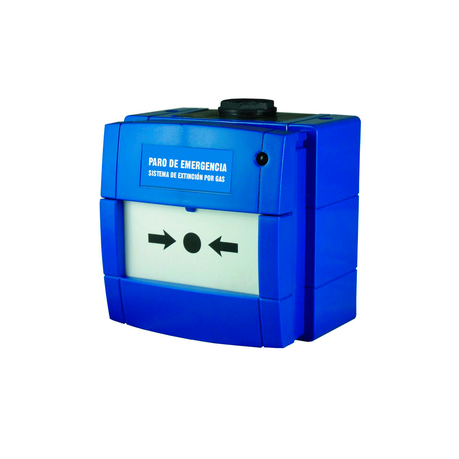 Pulsador de paro de Extinción IP67 por rotura de cristal, con contacto NA o NC, de color azul para sistemas de Extinción de incendios. Diseñado para uso en ambientes húmedos y montaje en superficie o empotrado mediante caja estándar.