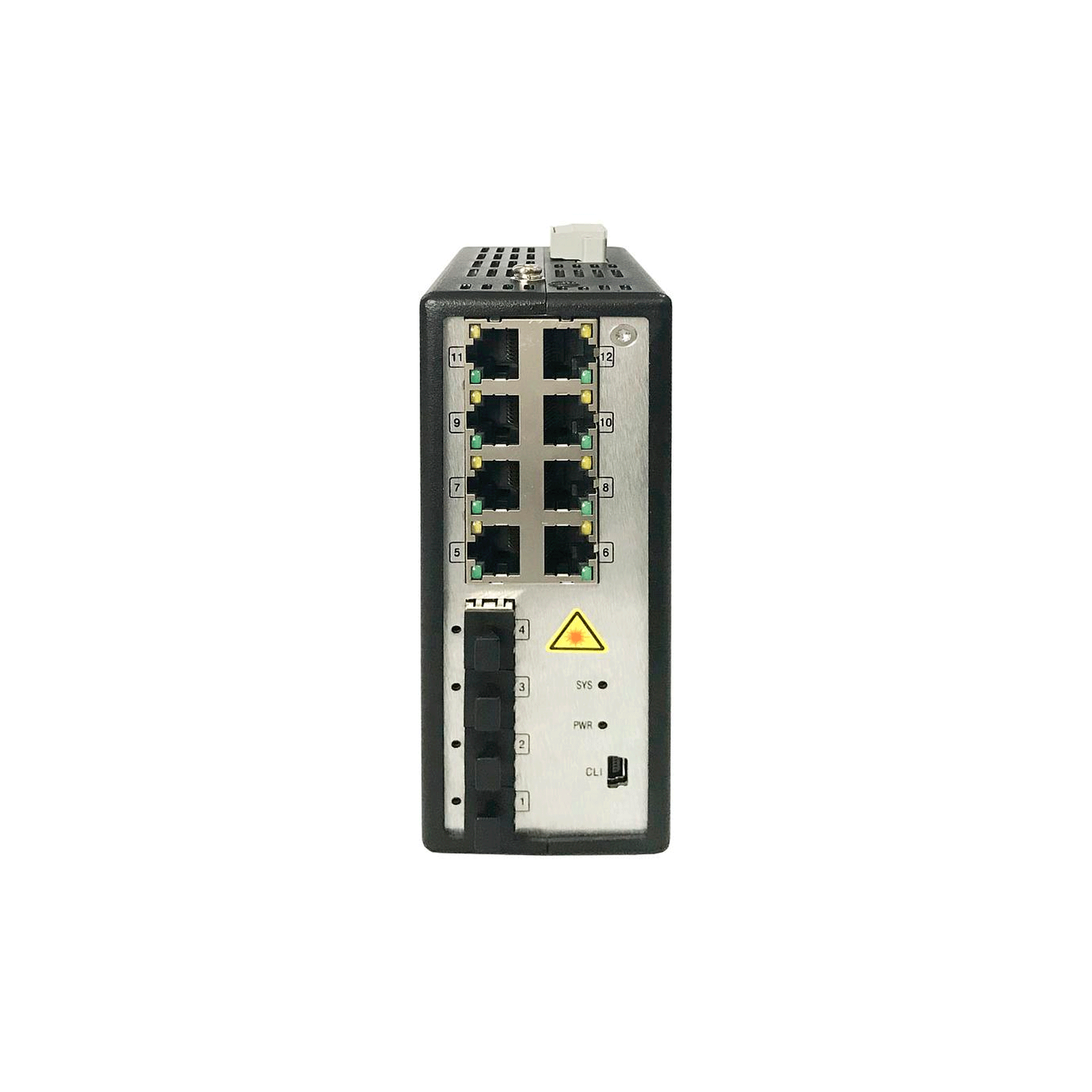 4 puertos 1000BaseX SFP y 8 puertos 802.3af/at PoE/PoE+ 10/100/1000BaseT. 1 puerto CLI serie de administración.