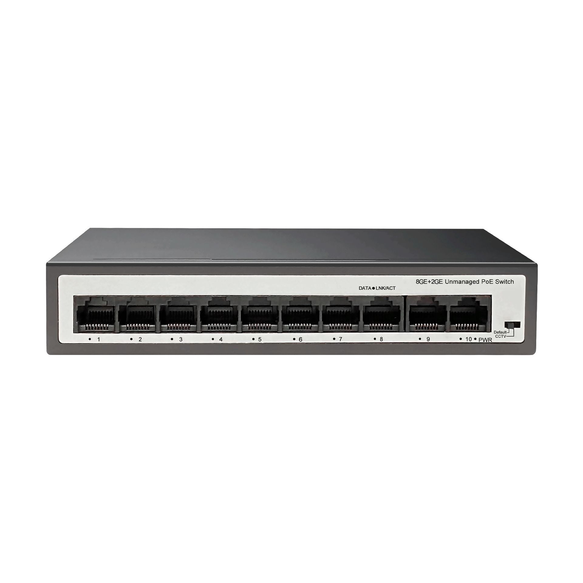 Switch PoE TBK de 8 puertos 10/100/1000 Mbps y 2 puertos Uplink 10/100/1000 Mbps. Incluye fuente de alimentación.