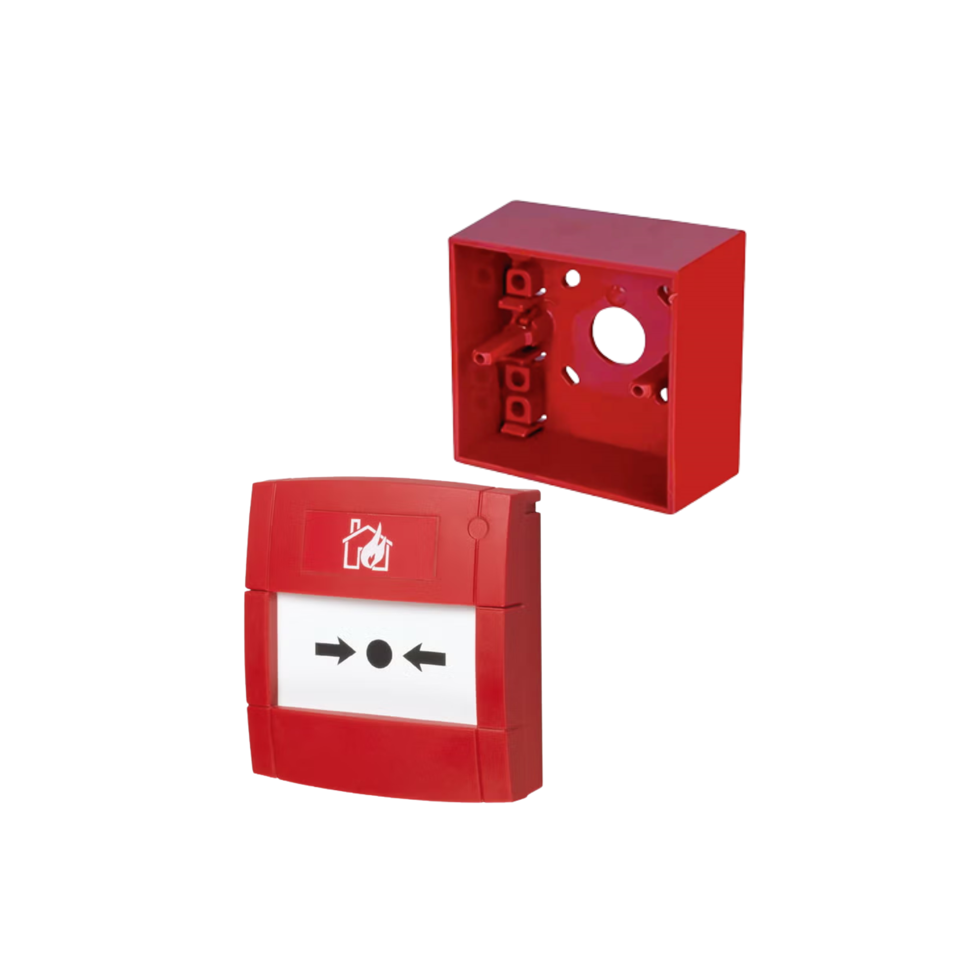 Botão de pressão manual embutido com caixa de montagem em superfície para botões de sistema de detecção de incêndio, vermelho, montagem embutida e em superfície, sistema inviolável, certificado EN54-11, dimensões 87 × 93 × 32 mm.